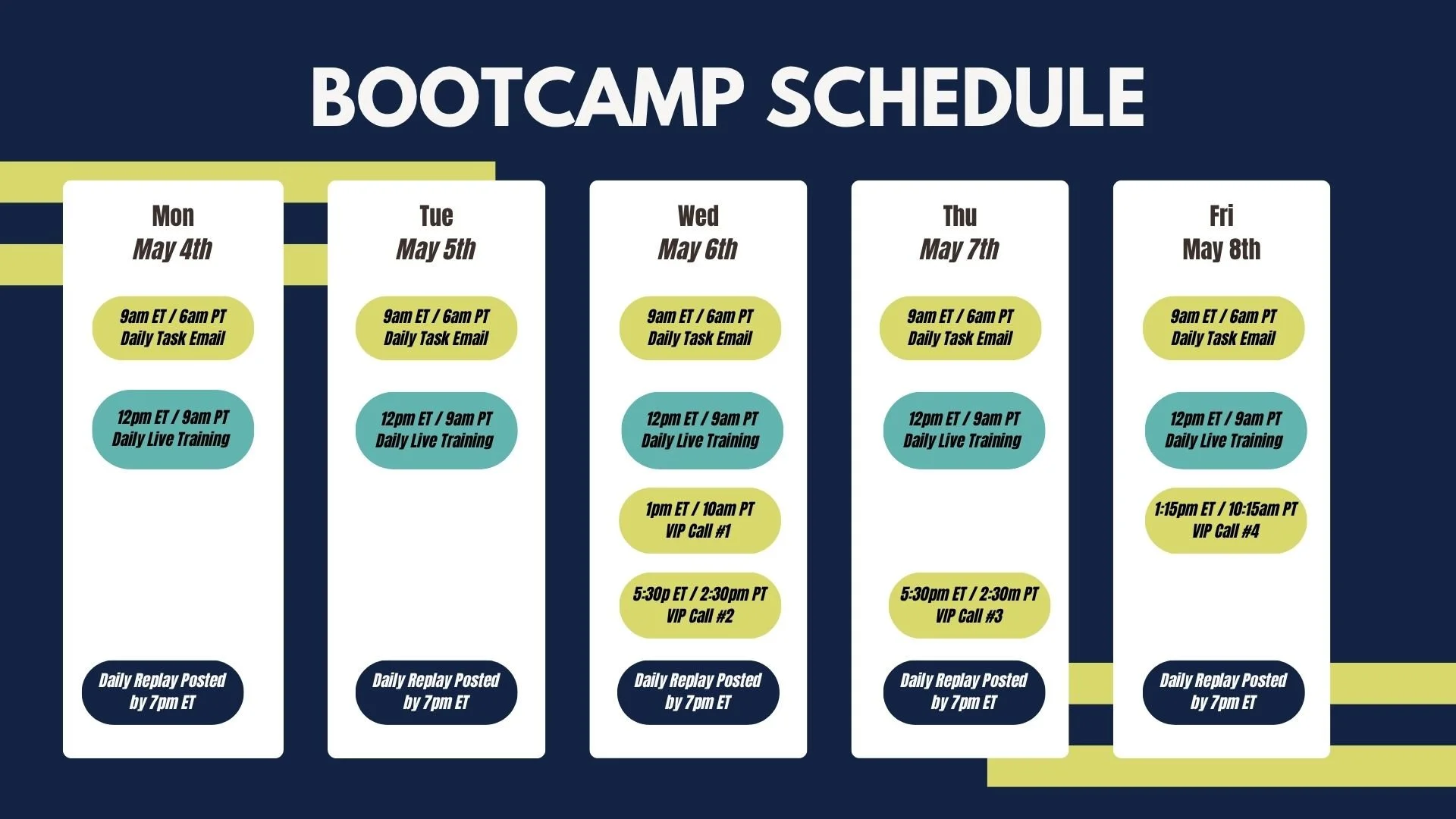 Yes, this live training that runs from May 4th - May 8th, 2026. We record and upload each day to a members area by 7 PM ET each evening of the bootcamp. Please note there is a "pop-up” Facebook Group/Community element with this program.